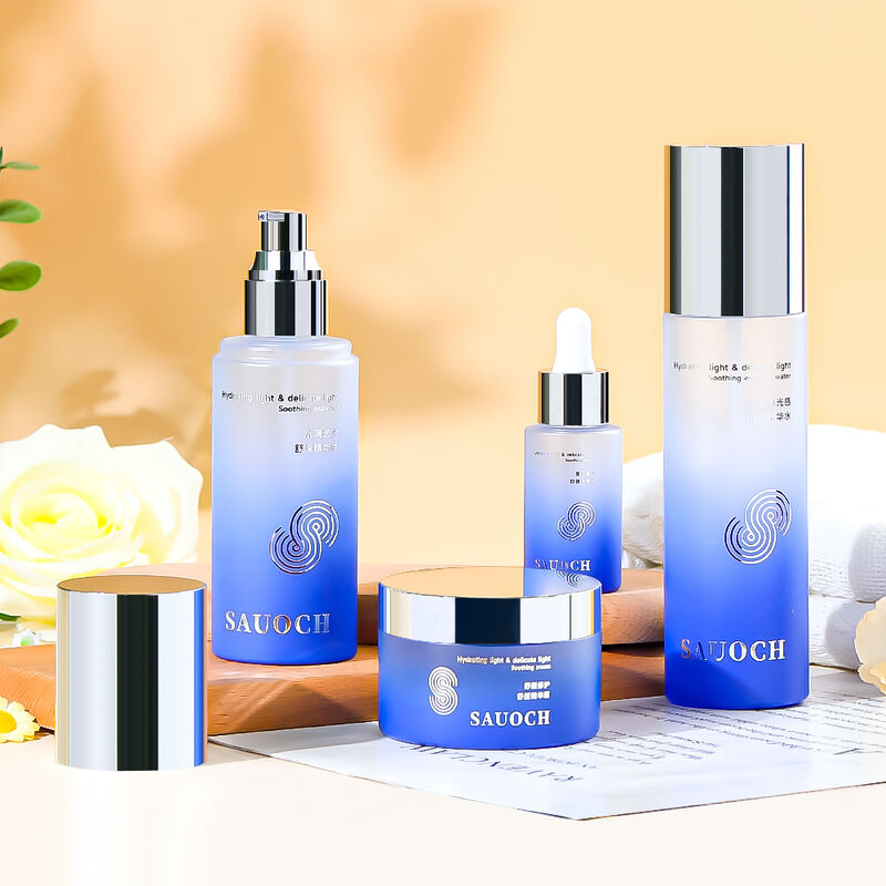 세련된 블루 그라데이션 불투명 마감과 실버 전기 도금 캡이 특징인 이 스킨케어 포장 세트는 스킨케어 제품의 시각적 매력을 향상시키는 고급스러운 외관을 제공합니다.